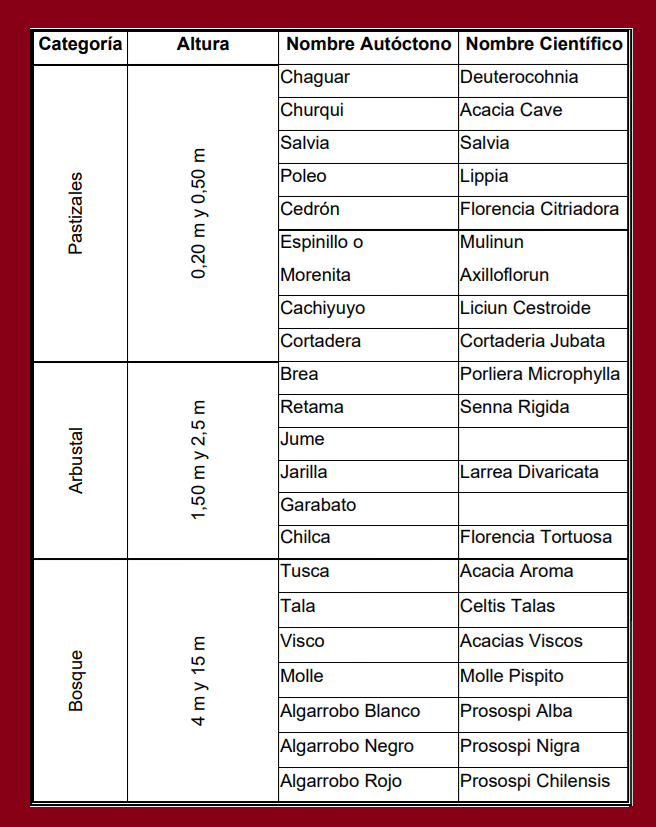 La vida vegetal, hasta los 5.000 m.s.n.m. encontramos pequeños musgos y líquenes, desde los 4.000 m.s.n.m. hasta los 3.000 m.s.n.m., encontramos el tipo de vegetales IRO – IRUCHO ,stipa hieronymusi, poa humillima. A los 3.000 m.s.n.m. apreciamos pastos rastreros en forma de cojín con robustos troncos subterráneos, tipo yareta, “cuernos de cabra, etc. Entre los 2.000 m.s.n.m. y los 3.000 m.s.n.m. por las características del terreno y del clima encontramos la tola, tolilla, iro. Irucho, tipas, arbustos en forma de cojín, cuernos de cabra, lampaya. Esta zona se caracteriza por tener componentes de tipo arbustivo de Norte a Sur, los mismos alcanzan una altura de entre 1 y 1.5 metros. Aproximadamente. Ejemplo: churqui, brea, espinillo, jarilla macho, jarilla hembra, retamo, del tipo en los ríos encontramos “totora”, en el sector Sur de departamento Tinogasta encontramos comunidades de juncos. Podemos apreciar comunidades arbustivas que superan los 1.30 cm. La brea,espinillo, jarilla macho, retamo, cardón.